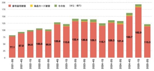 【図表】 出典: https://www.security-next.com/171121 【ニュース】 ◆クレカ不正利用、前四半期比2割増 - 200億円迫る勢い (Security NEXT, 2025/06/09) https://www.security-next.com/171121