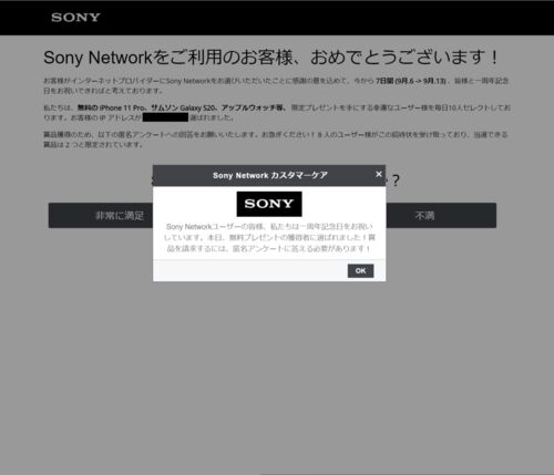 【図表】 出典: 筆者が観測したWeb画面【概要】 「Sony Networkをご利用のお客様、おめでとうございます!」というメッセージが表示される攻撃(誘導)を確認しました。 おそらくフィッシング系のサイトだと思いますのでご注意ください。プレゼントがもらえる…