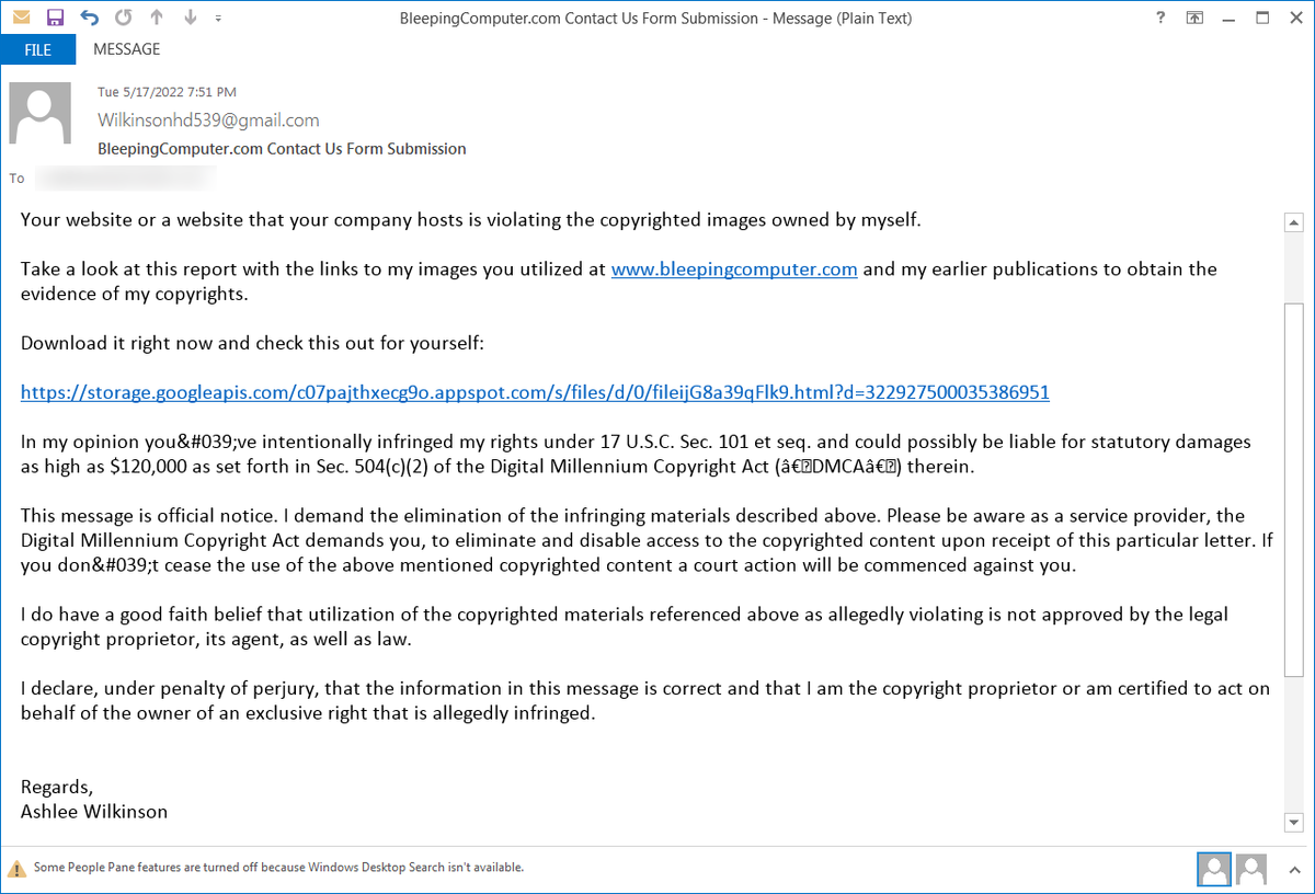 著作権侵害の誘い文句でマルウェアを送りつけるフィッシングメール 出典 BleepingComputer