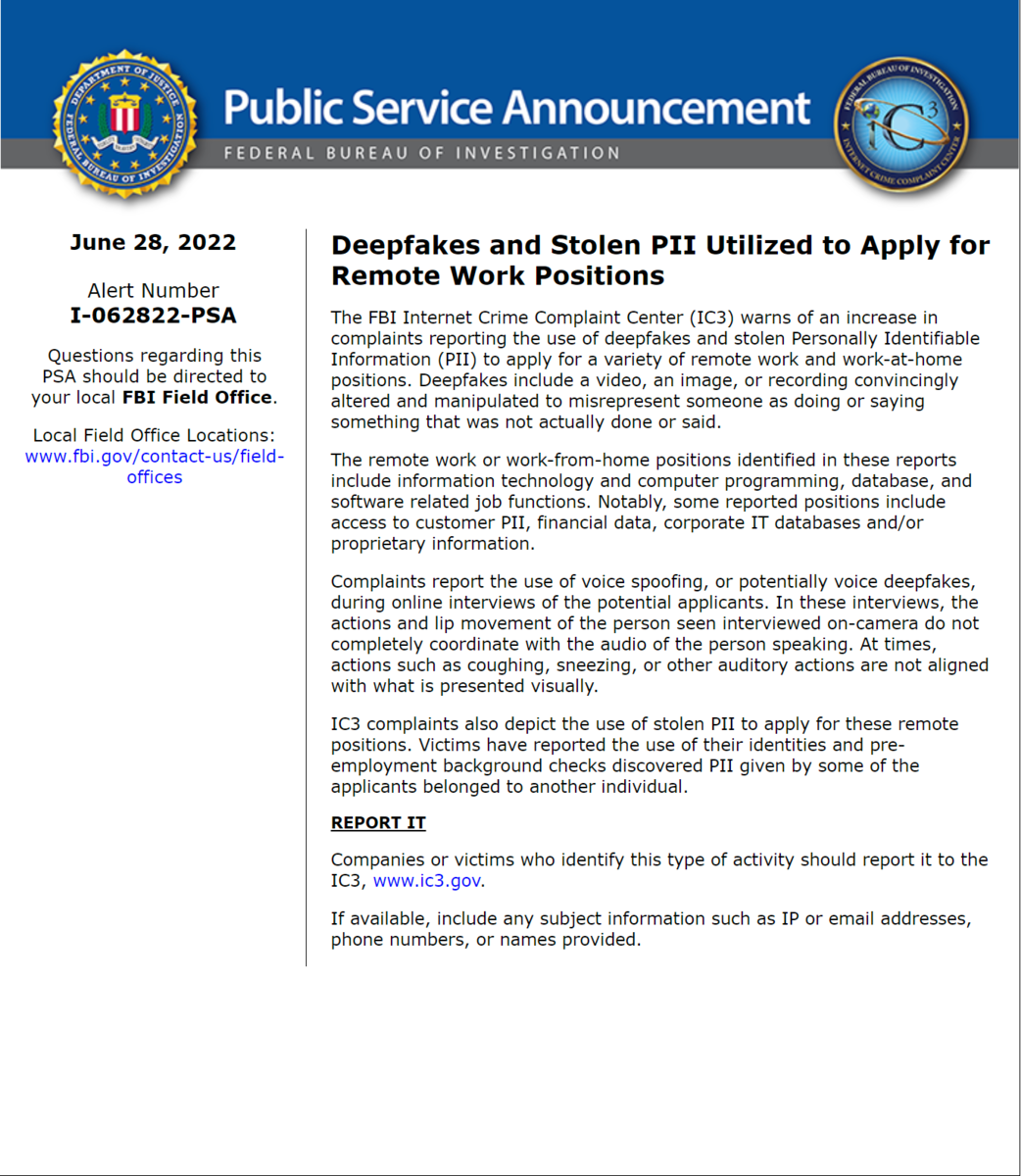 ◆Deepfakes and Stolen PII Utilized to Apply for Remote Work Positions (FBI, 2022/06/28)