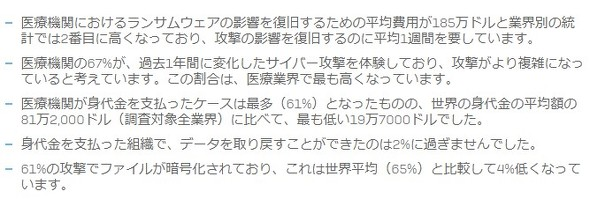 ◆医療業界を狙うランサムウェア攻撃、2倍近くに 身代金でデータが返ってきたのは2%のみ (ITmedia, 2022/07/26 18:00)