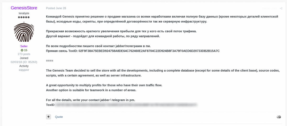 [ジェネシス・マーケットのインフラと在庫をハッカー・フォーラムで販売]