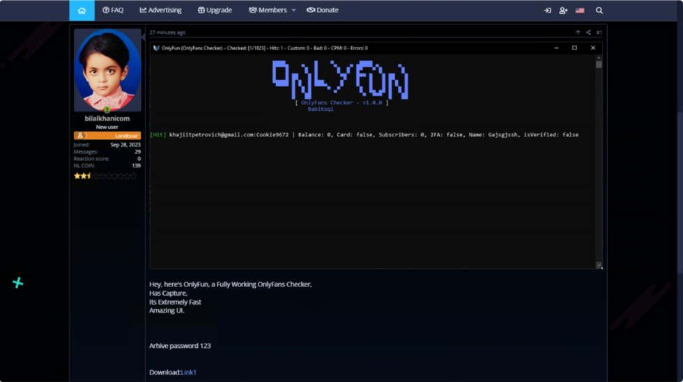 出典: https://www.bleepingcomputer.com/news/security/hacker-trap-fake-onlyfans-tool-backstabs-cybercriminals-steals-passwords/
