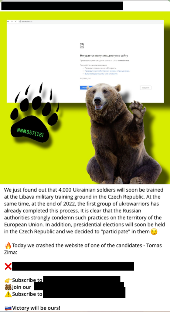 NoName057(16)の英語版テレグラムチャンネルに1月11日に投稿されたチェコの大統領候補に関するメッセージ(CyberScoop)