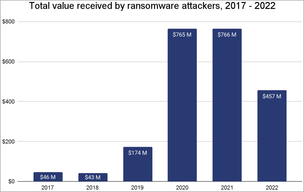 出典: https://www.bleepingcomputer.com/news/security/ransomware-profits-drop-40-percent-in-2022-as-victims-refuse-to-pay/
