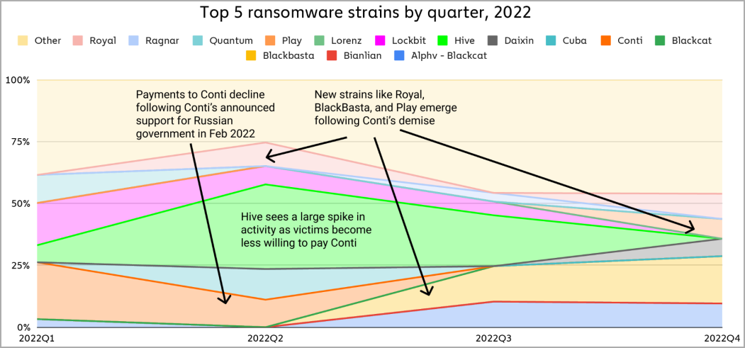 四半期ごとのランサムウェアギャングの活動状況(Chainalysis社)